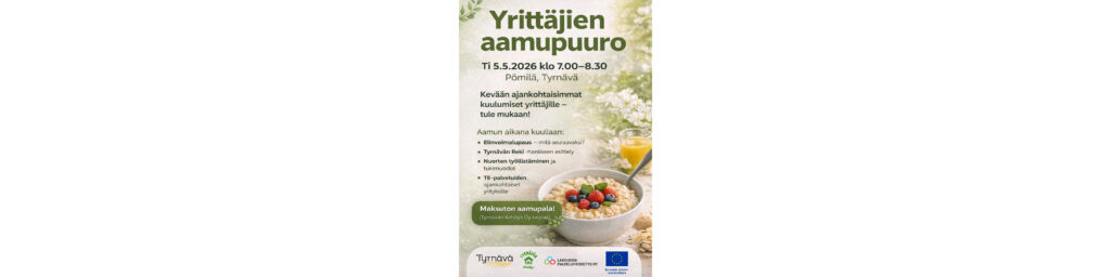 Tyrnävän Kehitys Oy ja Lakeuden Palveluyhdistys ry tarjoavat kaikille Tyrnävän yrittäjille maksuttoman aamupalan tiistaina 5.5.2026 klo 7.00-8.30 Ravintola Pömilässä. Aamupalan ohessa kuullaan: Elinvoimalupaus – mitä seuraavaksi? Tyrnävän Reki -hankkeen esittely Nuorten työllistäminen ja tukimuodot TE-palveluiden ajankohtaiset yrityksille Samalla yrittäjillä on erinomainen mahdollisuus saada uutta tietoa, kysyä mieltä askarruttavia kysymyksiä sekä keskustella ajankohtaisista asioista mm. […]